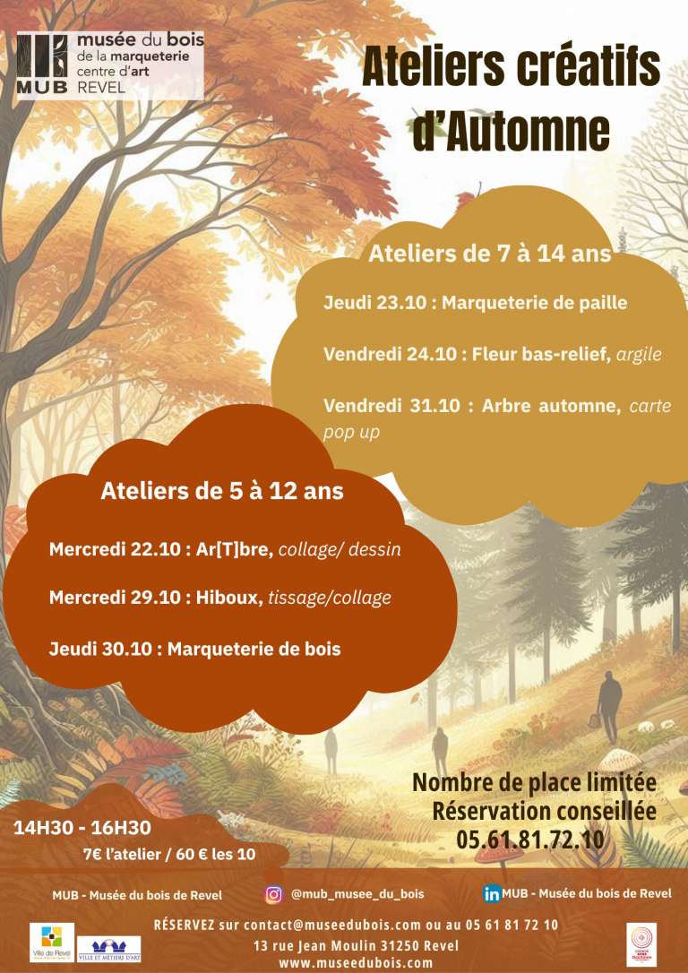 Pendant que les arbres tentent de coloriser leurs feuilles, pour revêtir leurs beaux manteaux d’automne, viens faire des ateliers créatifs au MUB ! La formule change cette saison : trois ateliers sont à destination des enfants de 5 à 12 ans, trois autres pour les enfants de 7 à 14 ans. Le programme est à télécharger ici.