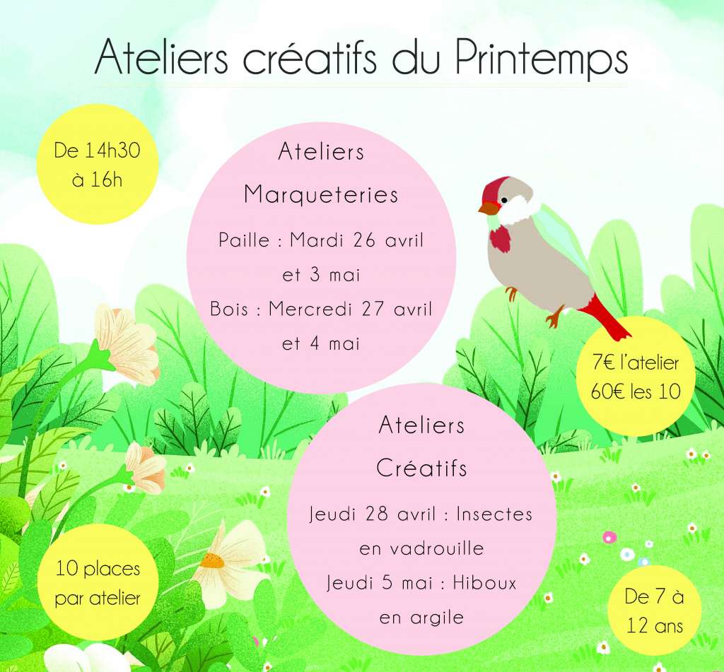 • Mardi 26 avril et 3 mai, ce sont les ateliers Marqueterie de Paille, où les enfants pourront fabriquer le décor d’une petite boîte à l’aide de brin de paille coloré.