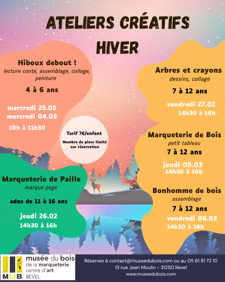 Pas très loin des montagnes, chaussé de tes plus belles moonboots et les mains chauffées dans tes mitaines, viens passer un moment créatif au musée du bois ! Tous les mercredis, les jeudis et vendredis des vacances, apprends en t’amusant et laisse libre cours à ton imagination. Notre équipe t’attend pour découvrir et réaliser une série d’ateliers sur le thème de la nature, des savoir-faire, et en lien avec les expositions temporaires.